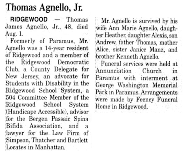 The partners, associates and staff of Simpson Thacher & Bartlett are saddened by the passing of their friend and colleague, Tom Agnello. We extend our heartfelt condolences to his wife, Ann Marie DeSciora and his children, Heather, Alexis and Andrew. Tom will be missed greatly. This was printed in the NY Times, August 4th, 1997.